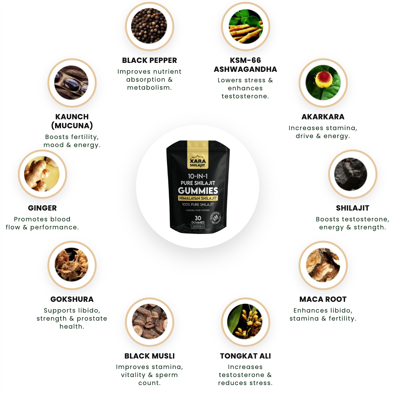 10 Potent Ayurvedic Ingredients Working in Harmony to Boost Vitality, Testosterone & Overall Wellness.